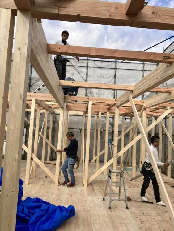さらに大きな下屋(一階部分の屋根)がある設計のため、構造的にもボリュームがあり、大工さんはなかなかの苦戦ぶりでした。