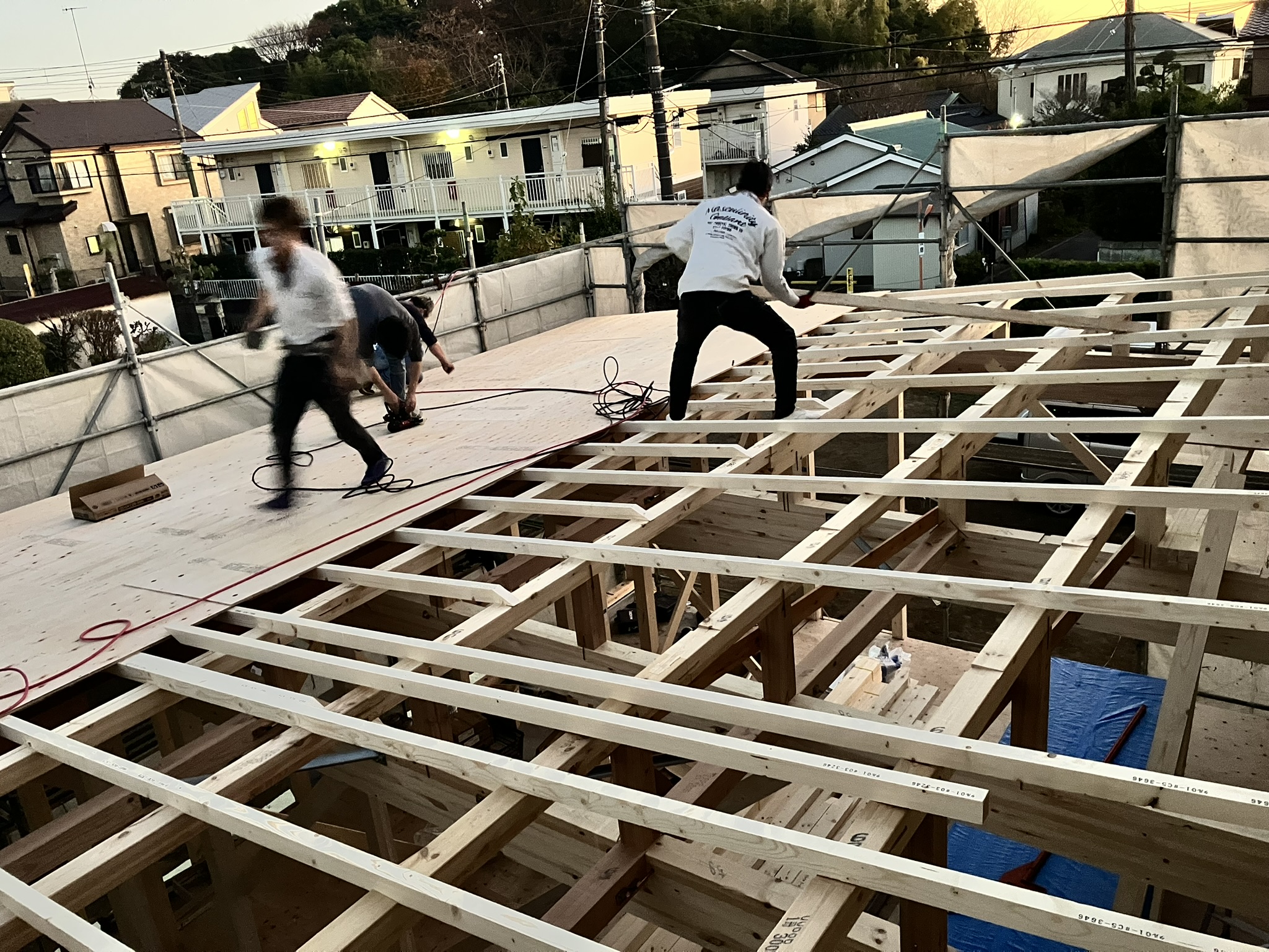 それでも経験豊富な職人さんたちのおかげで当日は下屋の下地も半分ほどまで終わり、無事に棟上げまでは完了しました。