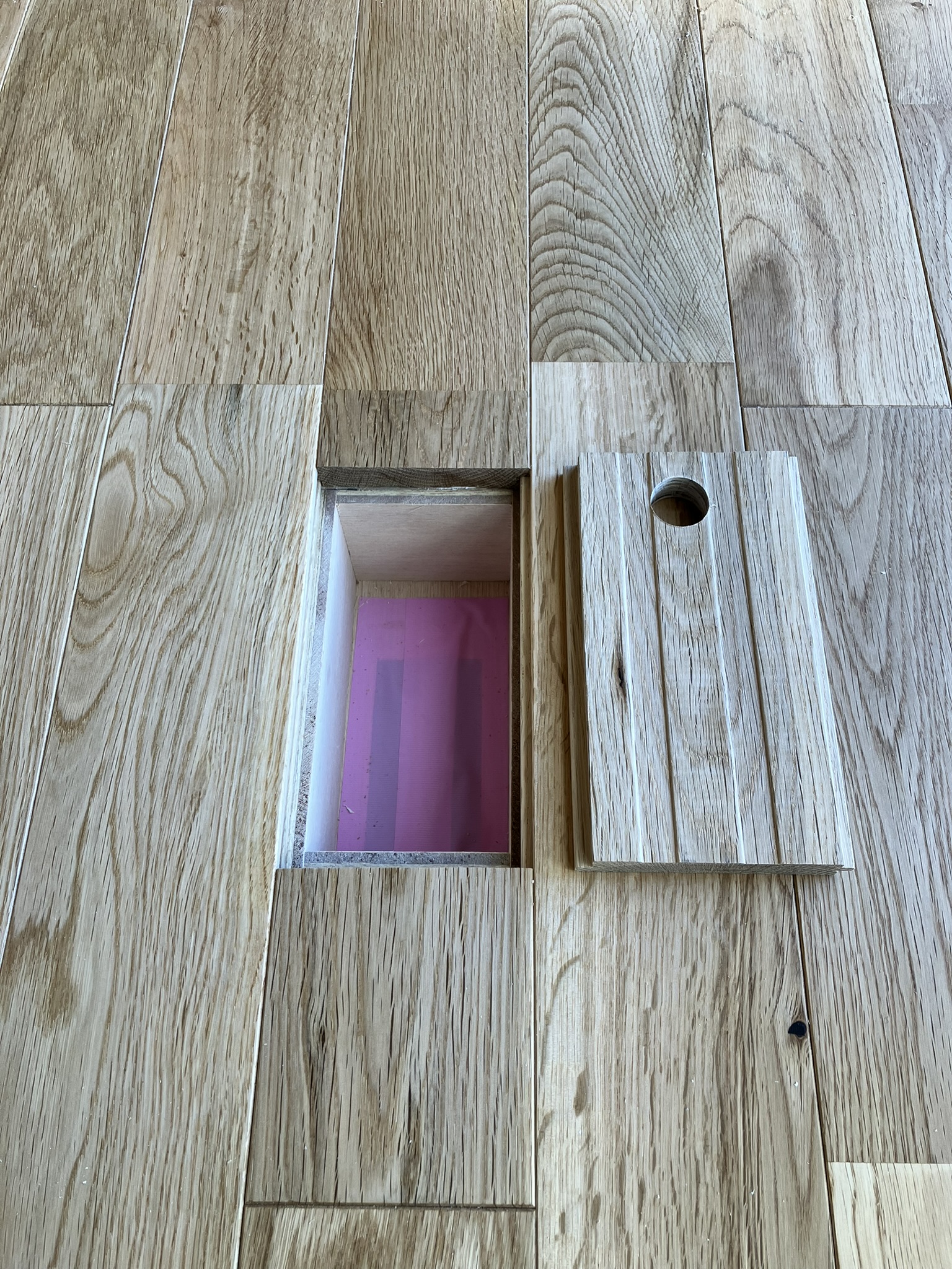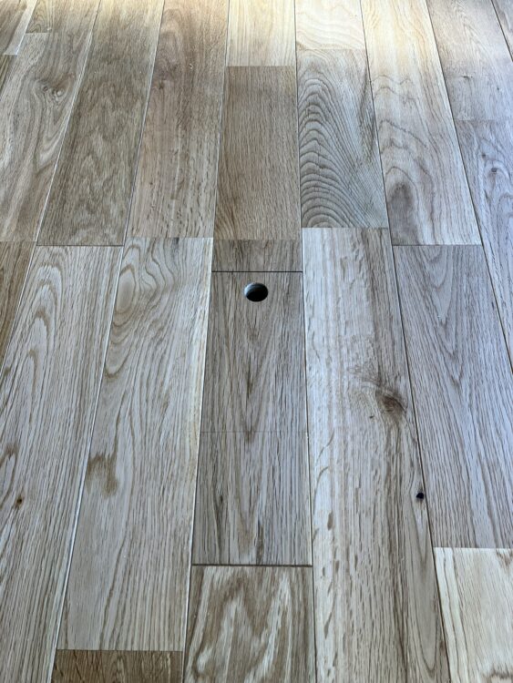 I様邸では無垢フローリングの質感を損なわないように、床コンセントを造作で工夫しました。