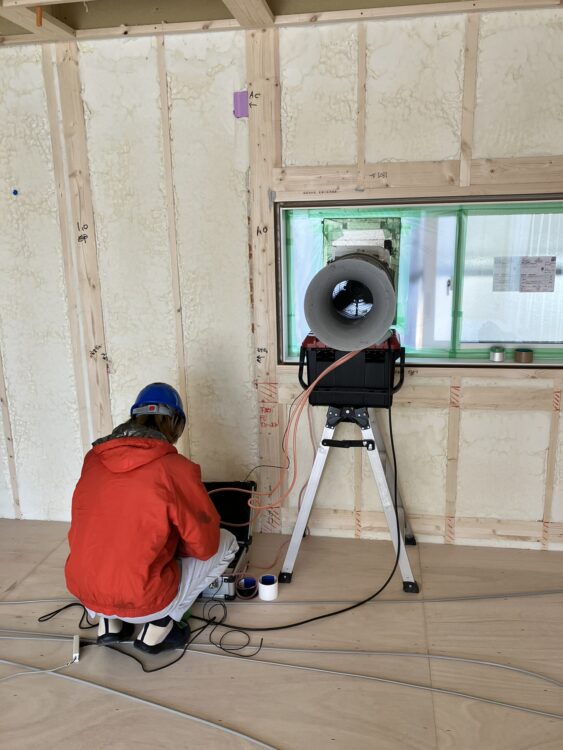 先日、建築中の茅ヶ崎市I様邸にて気密測定を行いました。